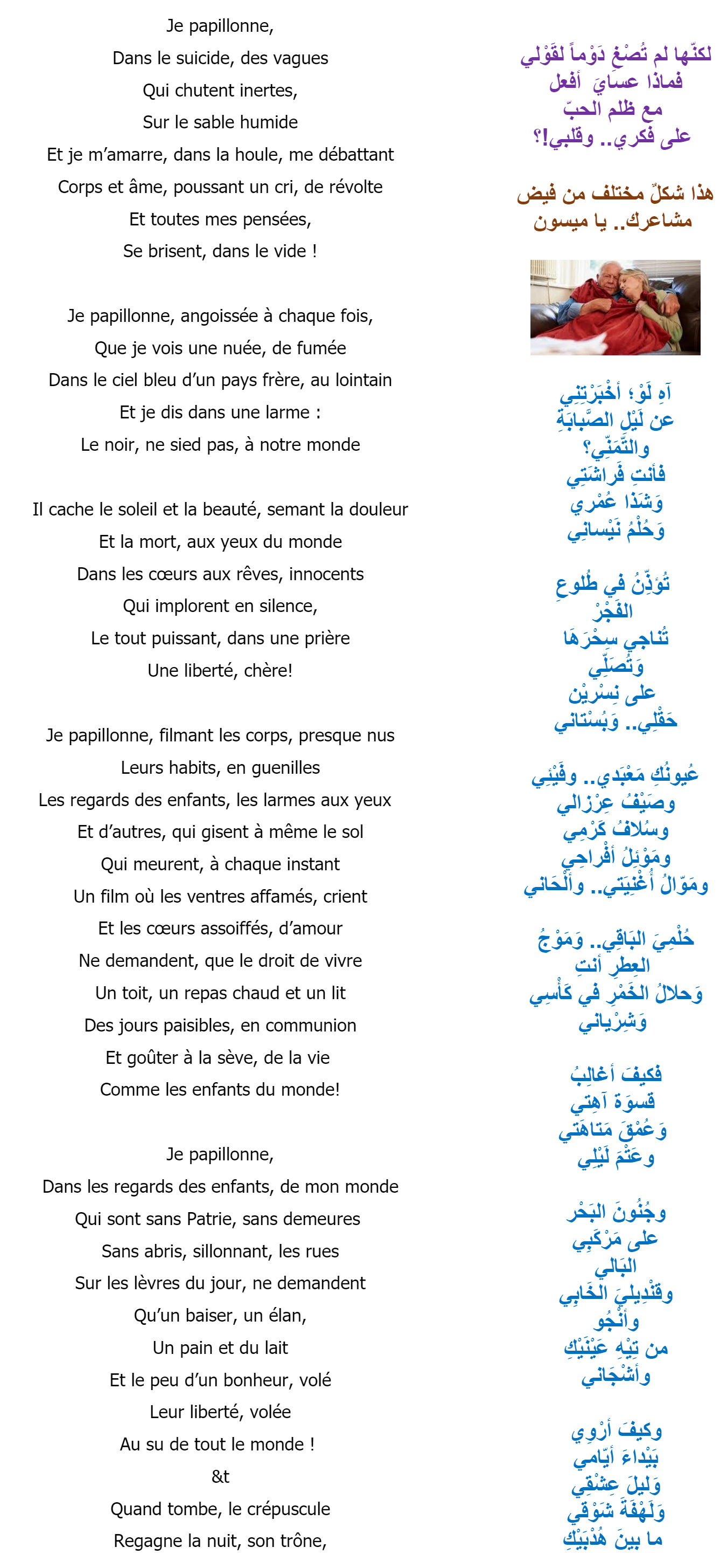 • البركة فيك بالعربي والفرنساوي، وبصدق مشاعرك يا ميسون، وألف شكر لك على ما تخصيني به دائما.. مع خالص مودتي وأحلى أمنياتي ومزيد من النجاح.. والتجلي.