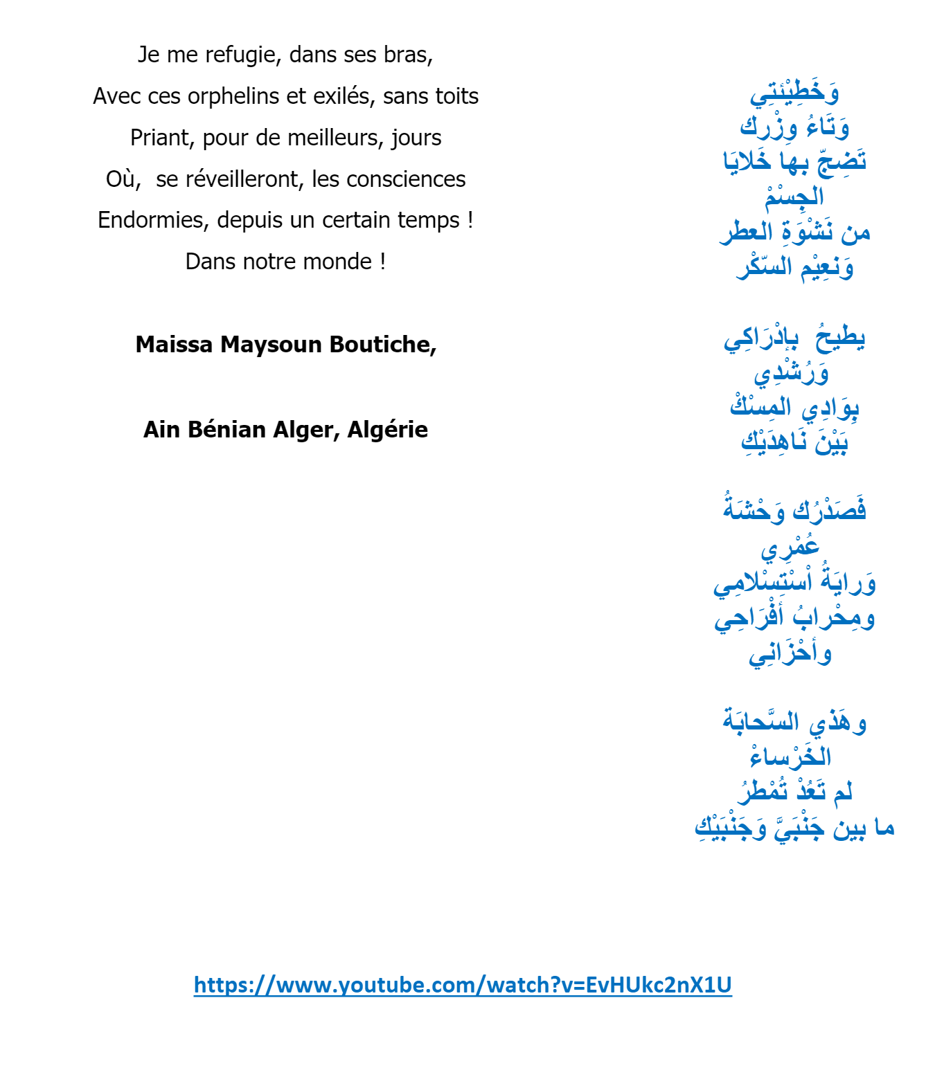 القصيدة “أقله بالعربي”؟ رائعة وأخاذة، وَفيها تَواؤمٌ وَثيقٌ بين اللفظ والمعنى. أحببت هذه العلاقة الجميلة القائمة بينكما. أنت إنسان رائع وأستاذ في الشعر، والنثر بمختلف أشكاله ومراميه. تزرع الحب والكلمة الطيبة في القلوب لأنك أنت هكذا في عمق روحك وقلبك، وميسون منعشة كالندى على خد الورود تستحق منك العناية والاهتمام الشديد.